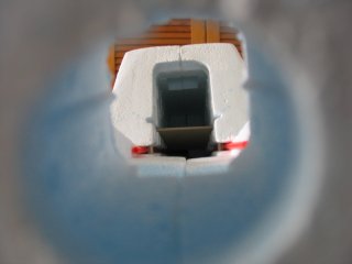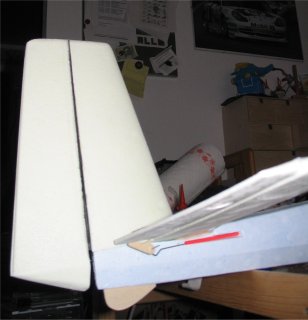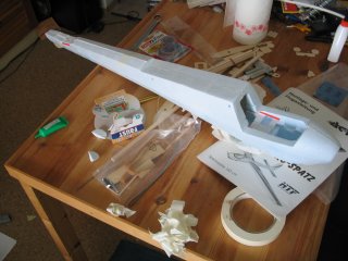 Der Erstflug ist mittlerweile absolviert, war auch relativerfolgreich. Jedenfalls hab' ich was gebaut, das grundsätzlich in der Lage ist zu fliegen. Allerdings musste der anfangs schön weit nach vorne geschobene Schwerpunkt wieder weiter nach hinten. Nach ein paar mehr oder weniger erfolgreichen Flügen gab's dann leider beim letzten mal das Problem dass das Flugzeug unbedingt steil nach unten wollte und sich nicht wirklich dafür interessiert hat, dass ich versucht habe mit dem Höhenruder dagengen zu halten. Also Bruchlandung. Dabei wurde die Rumpfspitze ziemlich in Mitleidenschaft gezogen, Ausgang ungewiss. Evtl. brauche hier einen komplett neuen Rumpf, mal schauen. Ich hoffe dass ich den Semesterferien im Sommer 2005 dazu komme das wieder hinzubiegen.