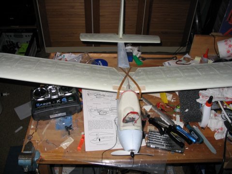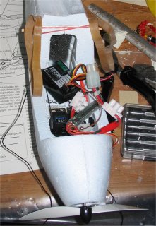 So, fast fertig- nur der Schwerpunkt ist noch etwas zu weit hinten, da muss ich mir noch was einfallen lassen. Aber das wird auch noch, da bin ich zuversichtlich. Man beachte die unorthodoxe Lage des Reglers in der Kanzel (im Kabelgewurstel) anstelle der Pilotenfigur.