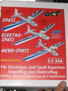 Das Ding kommt von der Firma ACT in Pforzheim, war beim Conrad aber billiger (!). Naja egal, jedenfalls ist es nicht "made in China", was ja durchaus schon mal ein Vorteil ist. Ausserdem ist der Spatz bewusst als Einsteigerflugzeug konzipiert (sagt ACT) und sollte damit dann ja eigentlich genau das richtige für mich sein. Vor irgendwelchen Flugversuchen steht aber noch einiges an Arbeit!