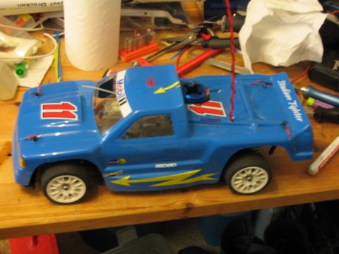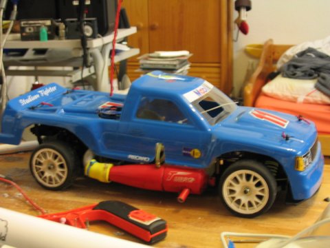 Nachtrag (23.01.2006): Irgendwie scheint das mit der "richtigen" Porsche- Karosserie wohl nichts mehr zu werden. Jedenfalls hab ich bis jetzt noch nicht angefangen sie zu bearbeiten. Habe einfach keine große Lust auf die Lackiererei und die zu erwartenden Probleme mit der Passgenauigkeit (v.a. im Bereich Resorohr, da dieses etwas über die Räder raus steht). Aber da ja immer noch die alte Stadium- Fighter Karosserie hier rumfährt, die schon lackiert und beklebt ist und auch noch nie (!) benutzt wurde, hab' ich mir gedacht dass man doch mal versuchen könnte die anzupassen. Mal schauen was dabei rauskommt. Also wurden erst mal die Karosseriehalter vom CR-2B auf's CR-4 übernommen. Wie zu erwarten war passt das gut, also kann jetzt drauf los "gedremelt" werden.